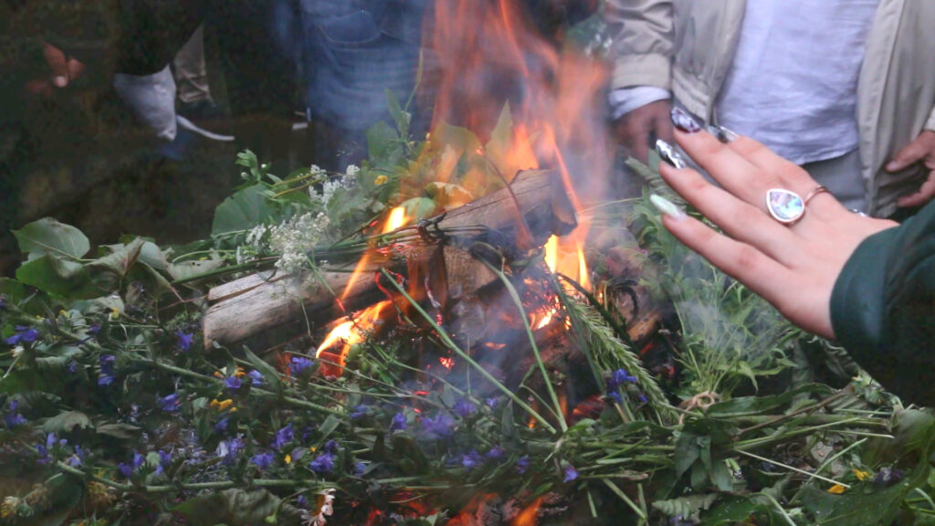 “Rasos with Wildflowers” uses a combination of digital video and audio material from traditional mid-summer festivals and digitized analog (35 mm) hand-processed film to document Lithuania’s intangible cultural heritage, reclaimed in modern times. In so doing, the piece weaves together past, present, and potentially the future. The phytogram film technique used herein involves using a mixture of vitamin C, washing soda, and polyphenols from Lithuanian wildflowers as a film developer, then soaking the film in a saltwater bath as a photo fixer for approximately 36-hours. This more ecologically sound film developing method pays homage to the visceral reverence for Nature that is so much a part of Lithuanian culture. It also lends a posthumanist lens to the heritage by giving voice to the flowers, via their chemical signatures, as active agents in the cultural festivals of the nation.